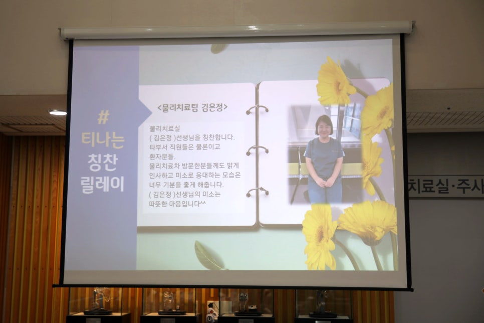 친절하고 성실히 일한 직원들을 릴레이 형식으로 칭찬하는 이달의 칭찬 릴레이는 물리치료실 김은정 선생님이 선정되었는데요. 환자들에게 밝게 인사하고, 미소로 응대하는 모습이 기분 좋게 해준다며 칭찬글을 남겨주셨습니다.