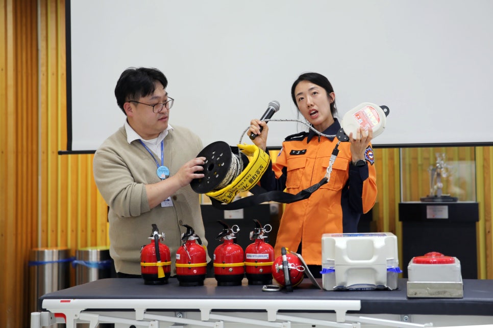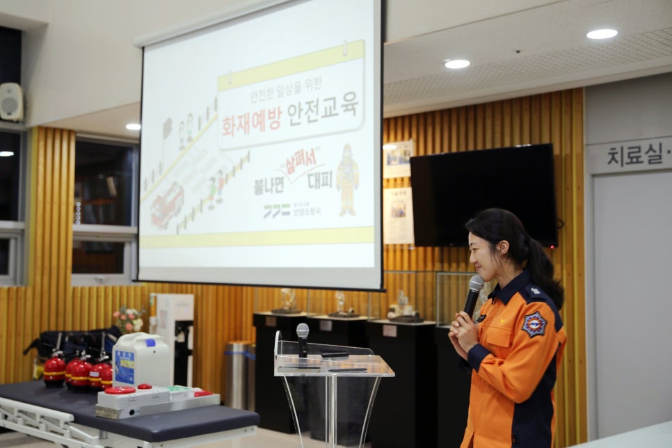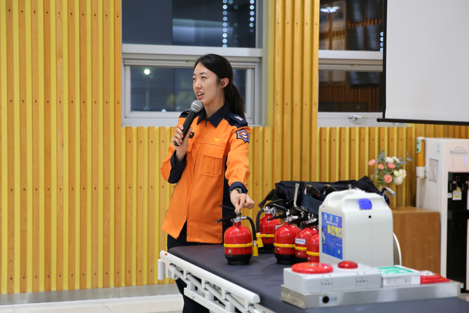안양소방서 김현하 강사님을 모시고 소방안전교육이 이어졌는데요. 이번 교육은 화재발생 시 대처 방법을 주제로 소화기 및 완강기 사용방법과 함께 화재 발생 시 대피요령에 대해 상세히 강의해 주셨습니다.