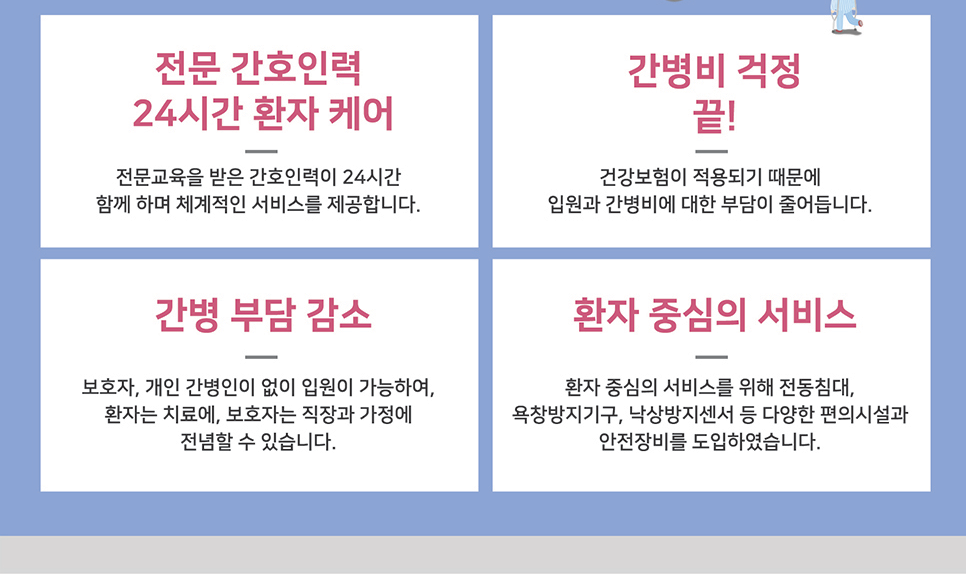 평촌우리병원은 보호자, 간병인이 필요 없는 간호간병 통합서비스 병동입니다. 보호자, 간병인 없이 입원이 가능하며, 전문 간호인력이 환자를 돌보는 환자 중심 통합서비스 입니다. 간호간병 통합서비스 무엇이 좋은가? 전문 간호인력 환자 케어 전문 교육을 받은 간호인력이 체계적인 서비스를 제공합니다. 간병비 걱정 끝! 건강보험이 적용되기 때문에 입원과 간병비에 대한 부담이 줄어듭니다. 간병 부담 감소 보호자, 개인 간병인이 없이 입원이 가능하여, 환자는 치료에, 보호자는 직장과 가정에 전념할 수 있습니다. 환자 중심의 서비스 환자 중심의 서비스를 위해 다양한 편의시설과 안전장비를 도입하였습니다.  |